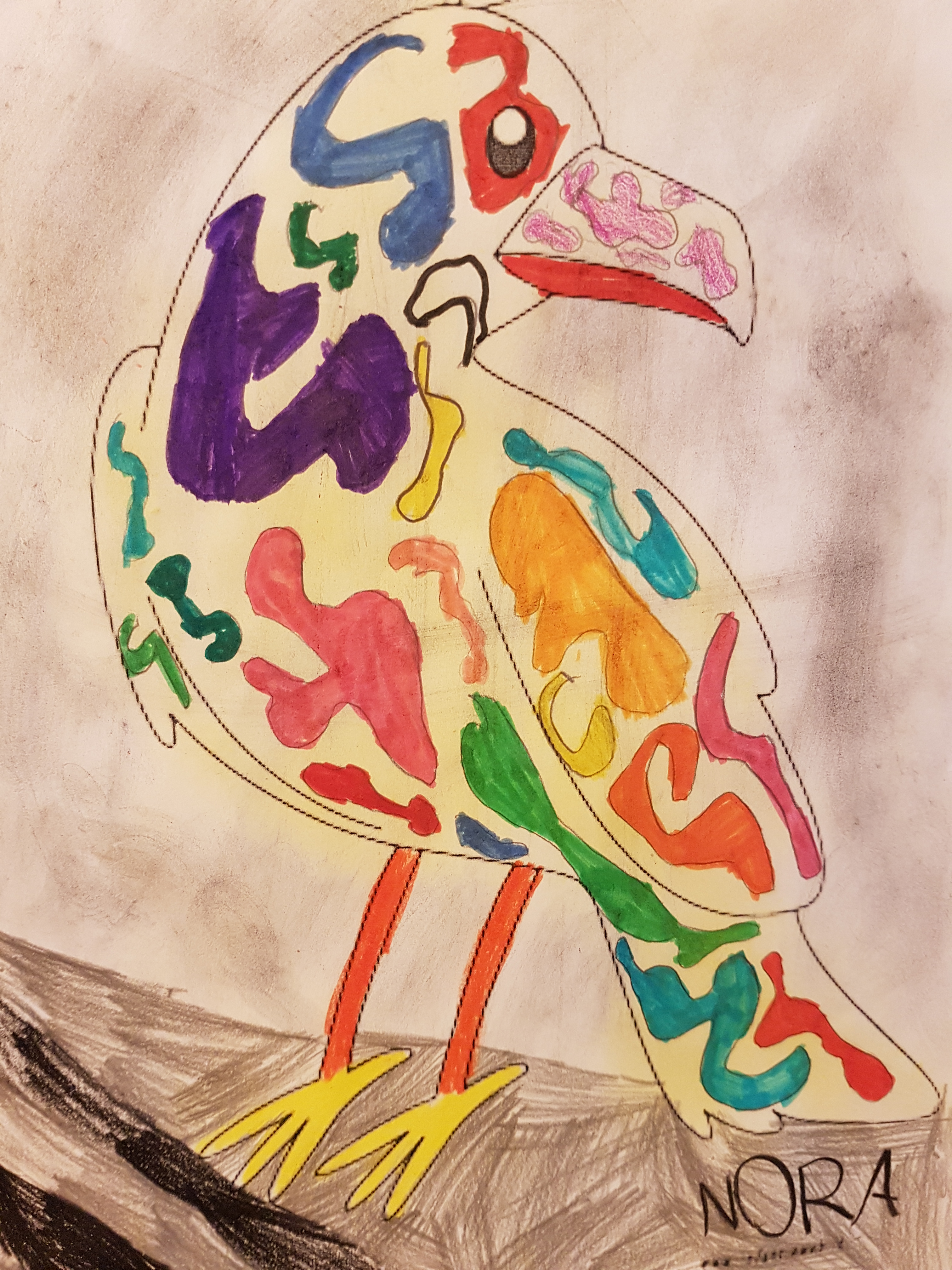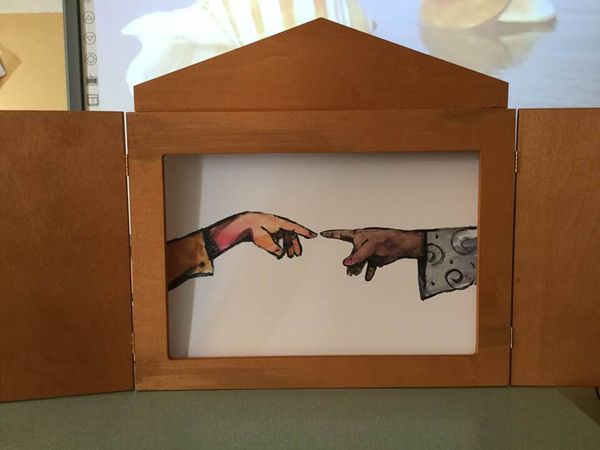 Giocare con le forme di Picasso, far parlare le figure volanti di Chagall… Si possono realizzare con i bambini dei tableau vivant e utilizzarli per scrivere un racconto da rappresentare al Kamishibai. Si parte da un’idea, poi viene fatto il progetto; scritta la storia, viene suddivisa in sequenze. Nei piccoli gruppi si realizzano le tavole (max15/20) con immagini e parole ed infine c’è la narrazione. La cosa importante è che il testo sia puro, essenziale, senza tanti orpelli, significativo, e non troppo lungo (max 350 caratteri per ogni tavola compresi gli spazi). Per quanto riguarda le tecniche se ne possono usare delle più svariate: texture, frottage, strappo, stencil, a spruzzo, ritaglio, pastelli a olio, fotografia,collage, mista… La cosa importante è non appesantire, non mettere troppi particolari, connotare i personaggi , lasciando spazio all’immaginazione.