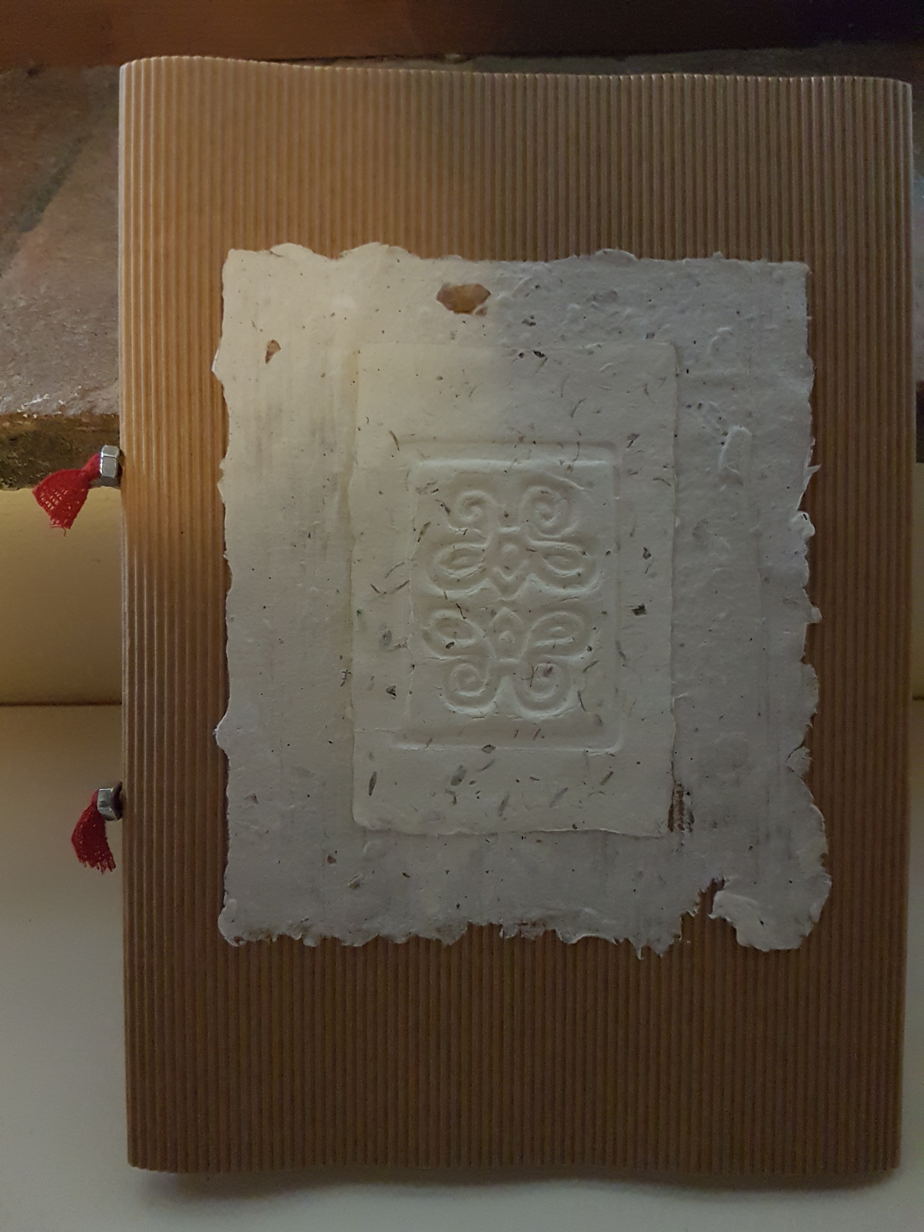 La rilegatura si può fare facendo passare un nastrino attraverso due piccoli fori fatti nella piegatura interna dei fogli e fermarlo all’esterno con due bulloncini.