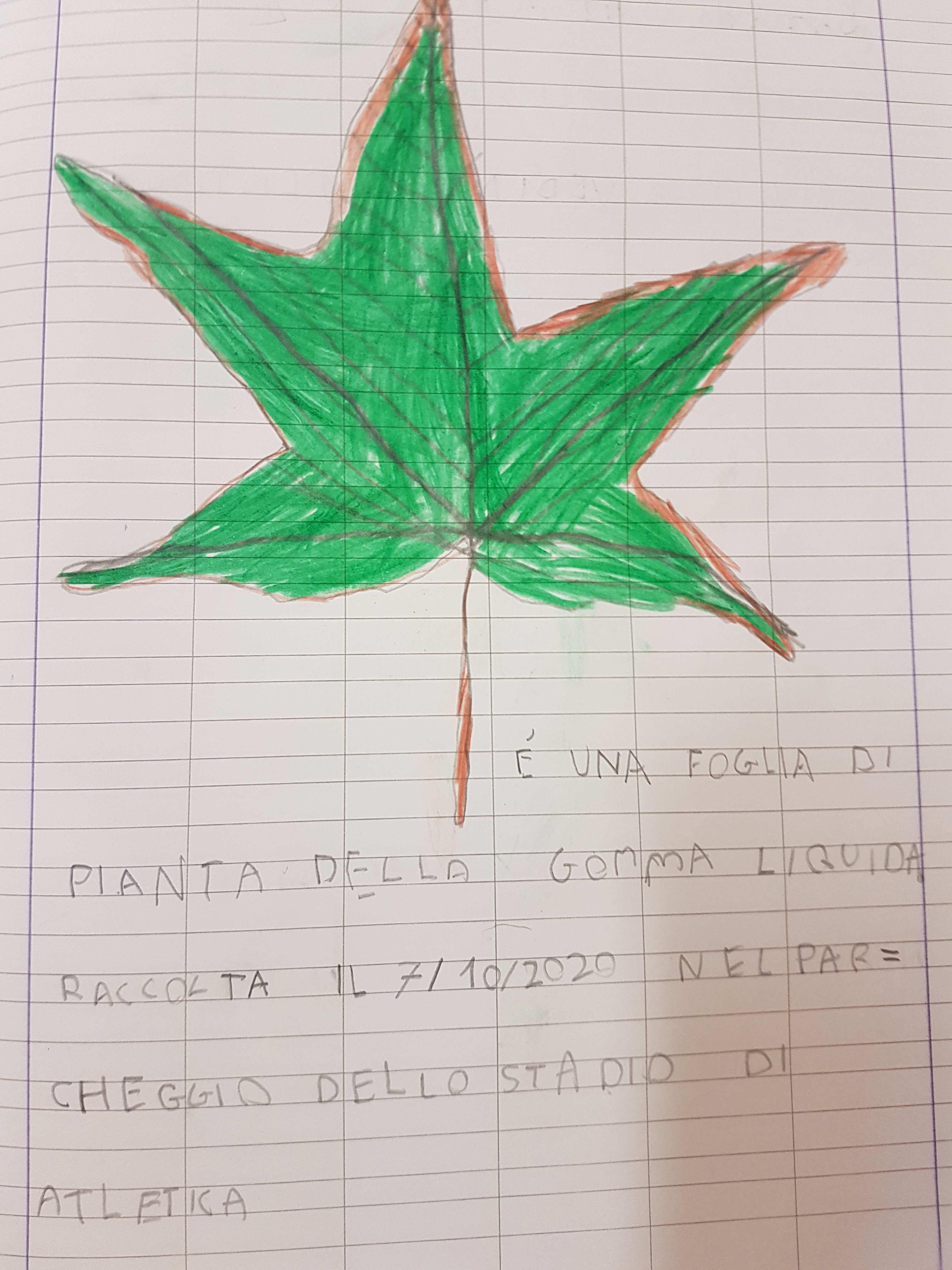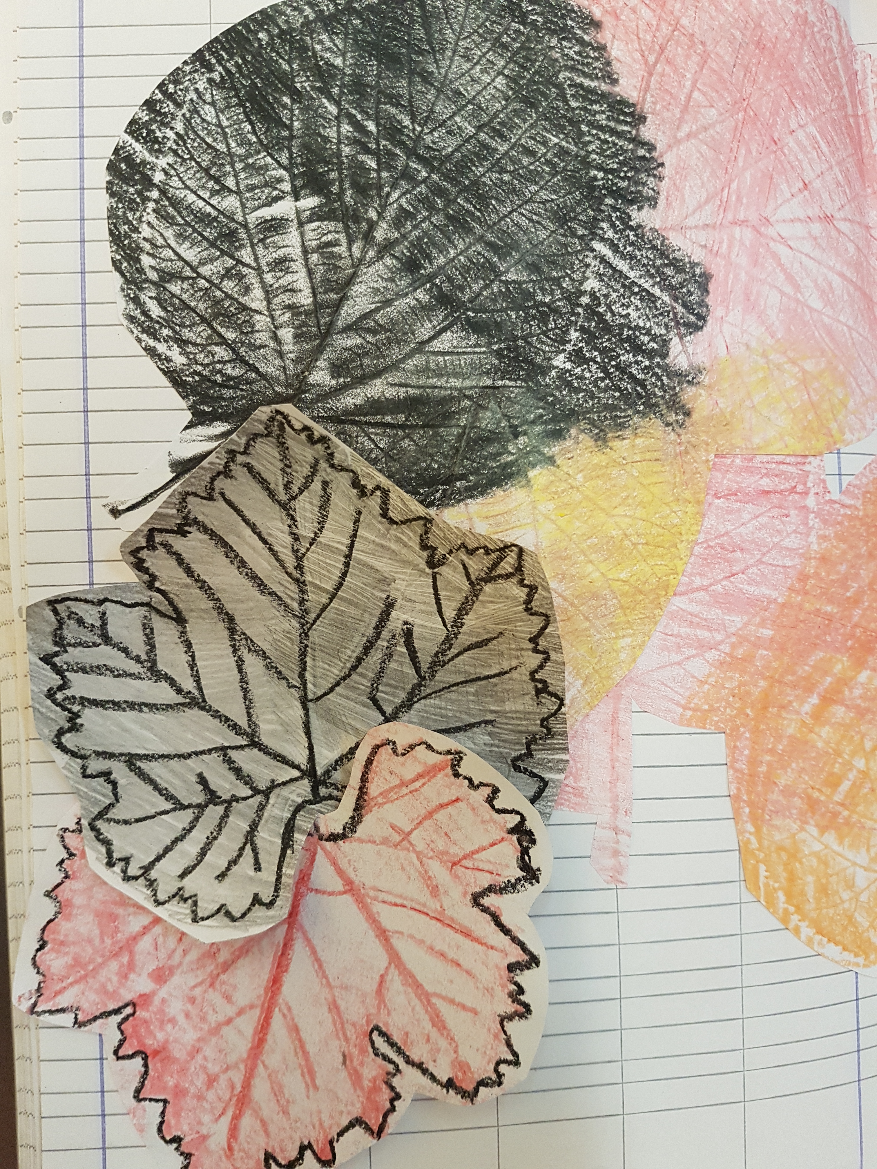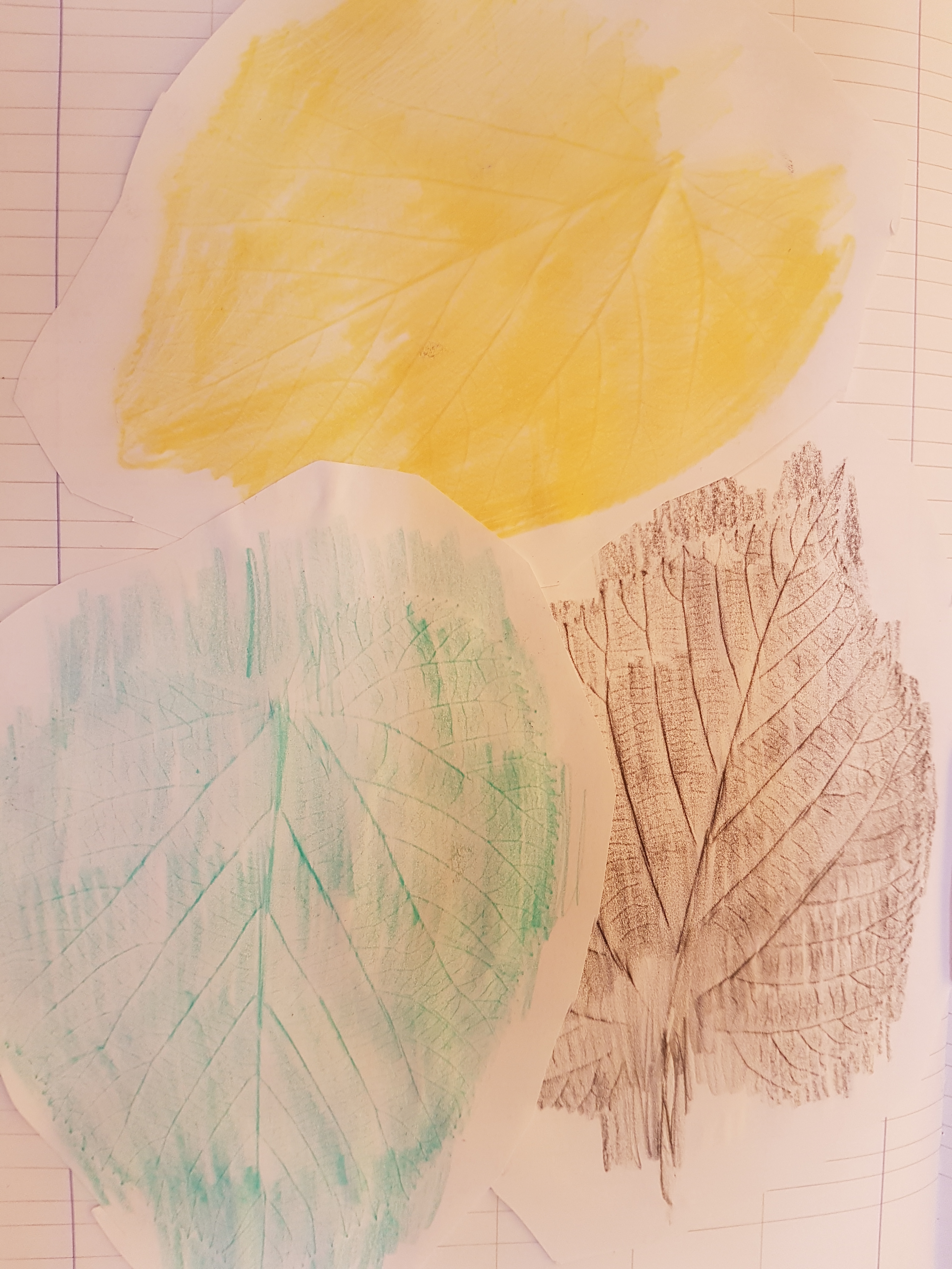 Ciascuno si mette al lavoro per riprodurre al meglio la propria foglia. Si usano diversi sistemi: c’è chi traccia il contorno della foglia e poi colora l’interno con le matite, chi usa la tecnica del frottage con i pastelli a cera, chi il chiaroscuro usando il lapis e mettendo qualche punto di colore al centro… Poi ad ogni foglia viene apposta una scritta con: nome della pianta da cui proviene, data e luogo della raccolta, riferimento ad un episodio in particolare che accade in quel giorno (per es. è il compleanno di…/mi è caduto un dente…ecc. )