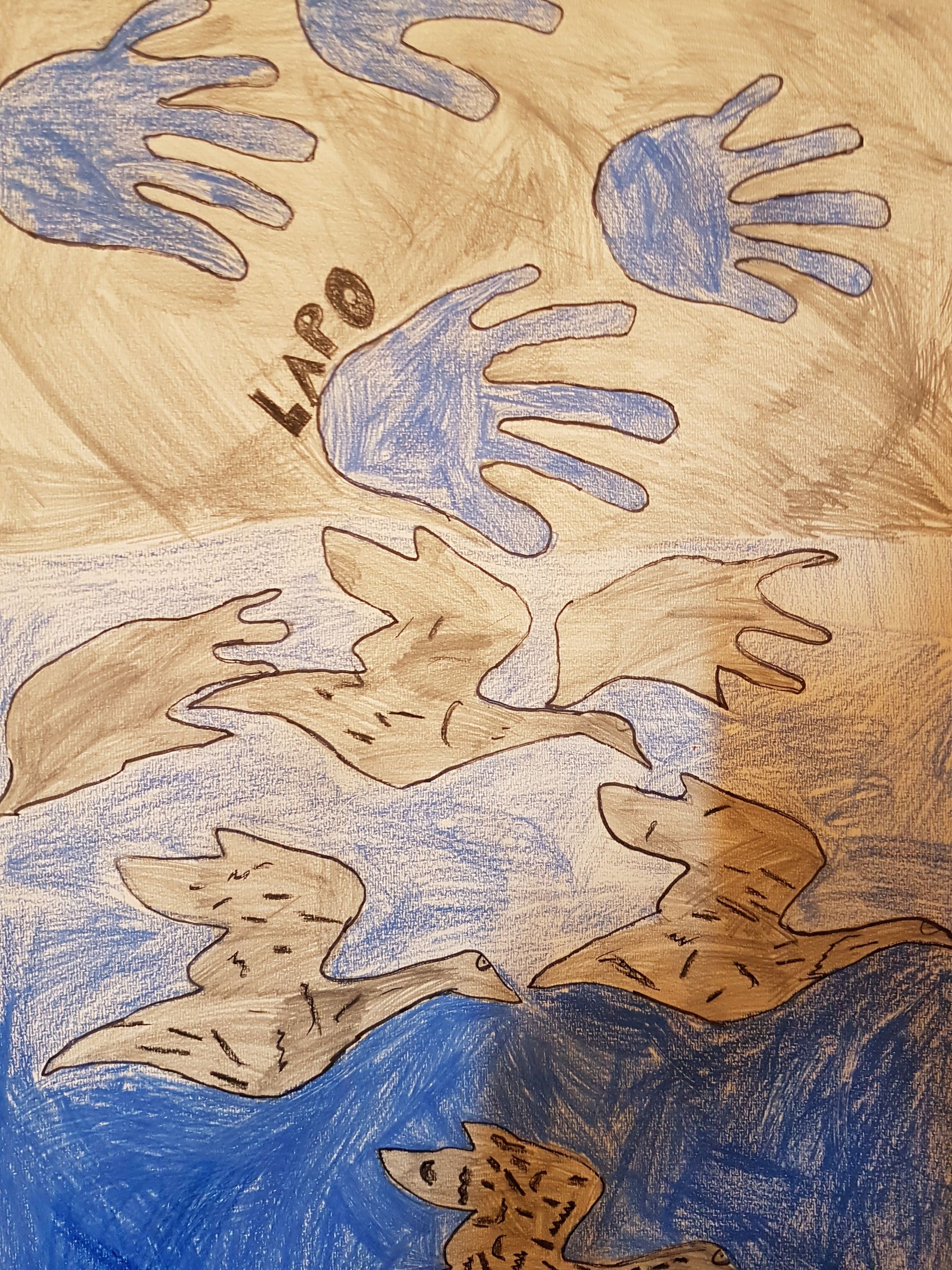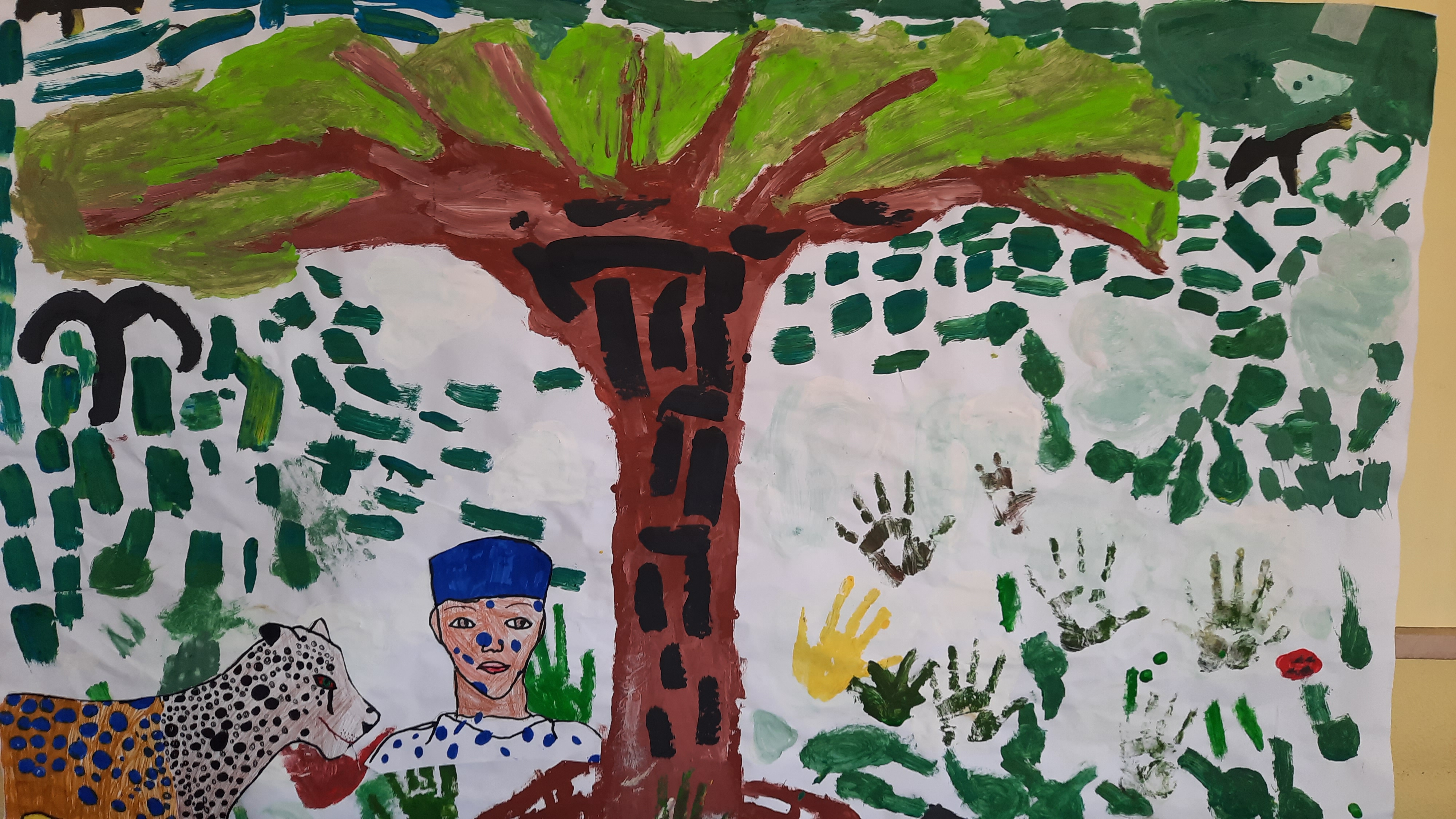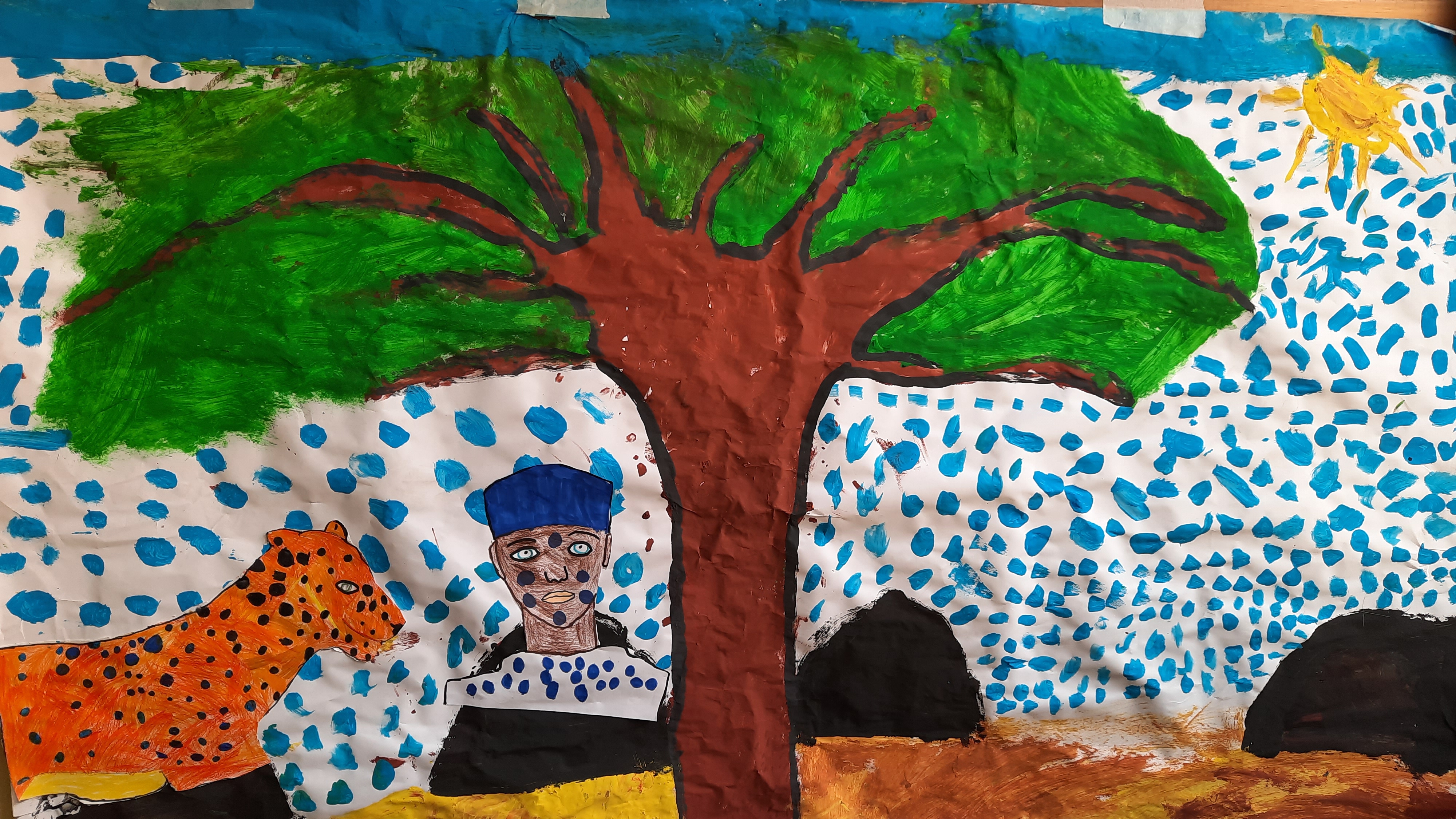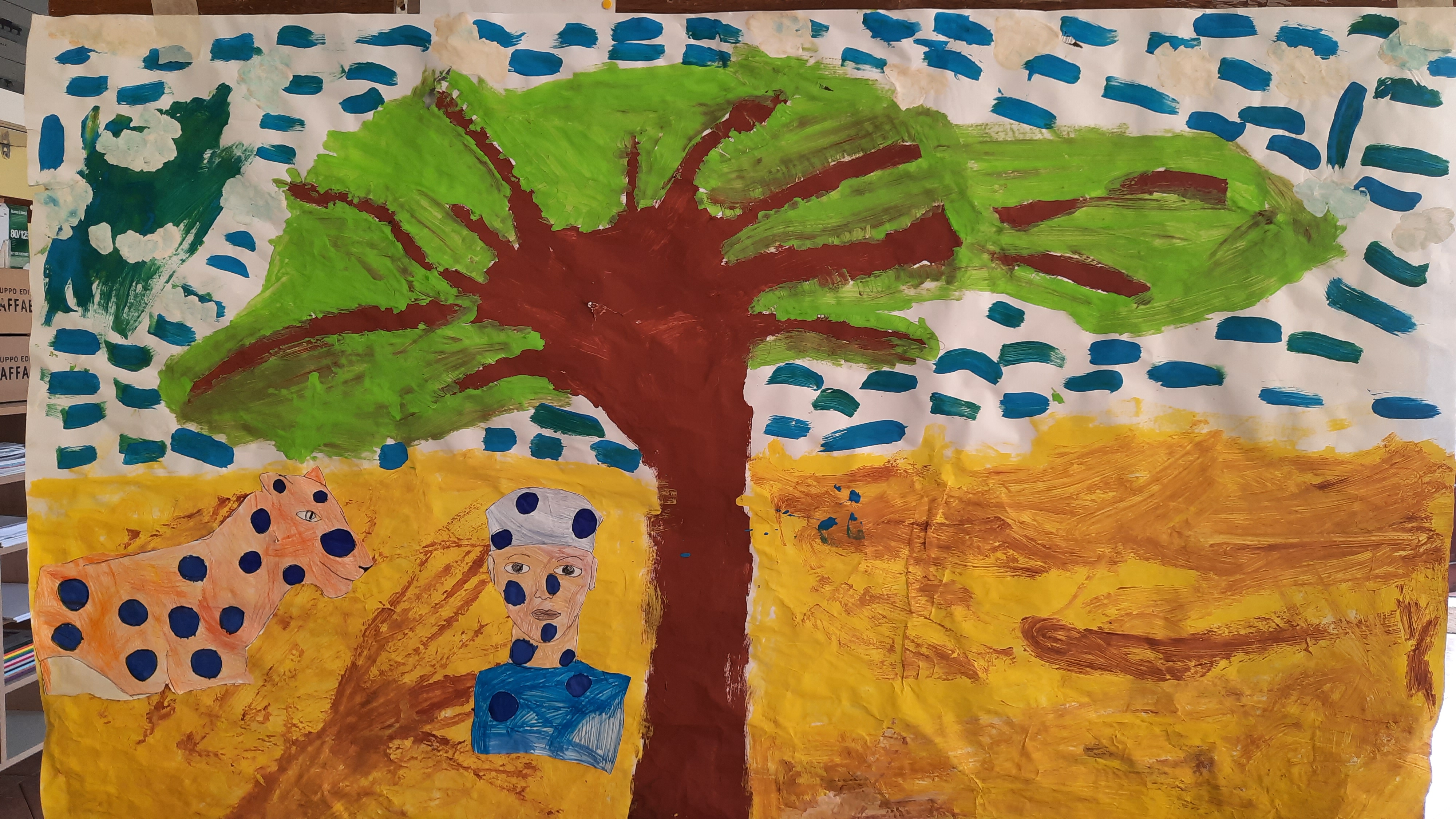 Entrare in empatia con l’altro. In questo caso si tratta di un animale, un predatore selvatico: il ghepardo. La storia racconta l’incontro tra un bambino e questo felino nato diverso dai suoi simili. Entrambi provano le stesse emozioni; in fondo l’altro, anche se così diverso fisicamente, è “come me”. Si osservano l’ambiente della savana e l’albero-casa (il sicomoro) e come si svolge la vita dei suoi abitanti. Attività espressiva: a piccoli gruppi, gli alunni progettano e organizzano il lavoro che consiste nel rappresentare l’incontro tra i due protagonisti nella savana africana. Su un grande foglio vengono incollate le sagome, precedentemente preparate, di un grande sicomoro, del bambino e del ghepardo. Il lavoro viene colorato a tempera utilizzando varie tecniche e texture.