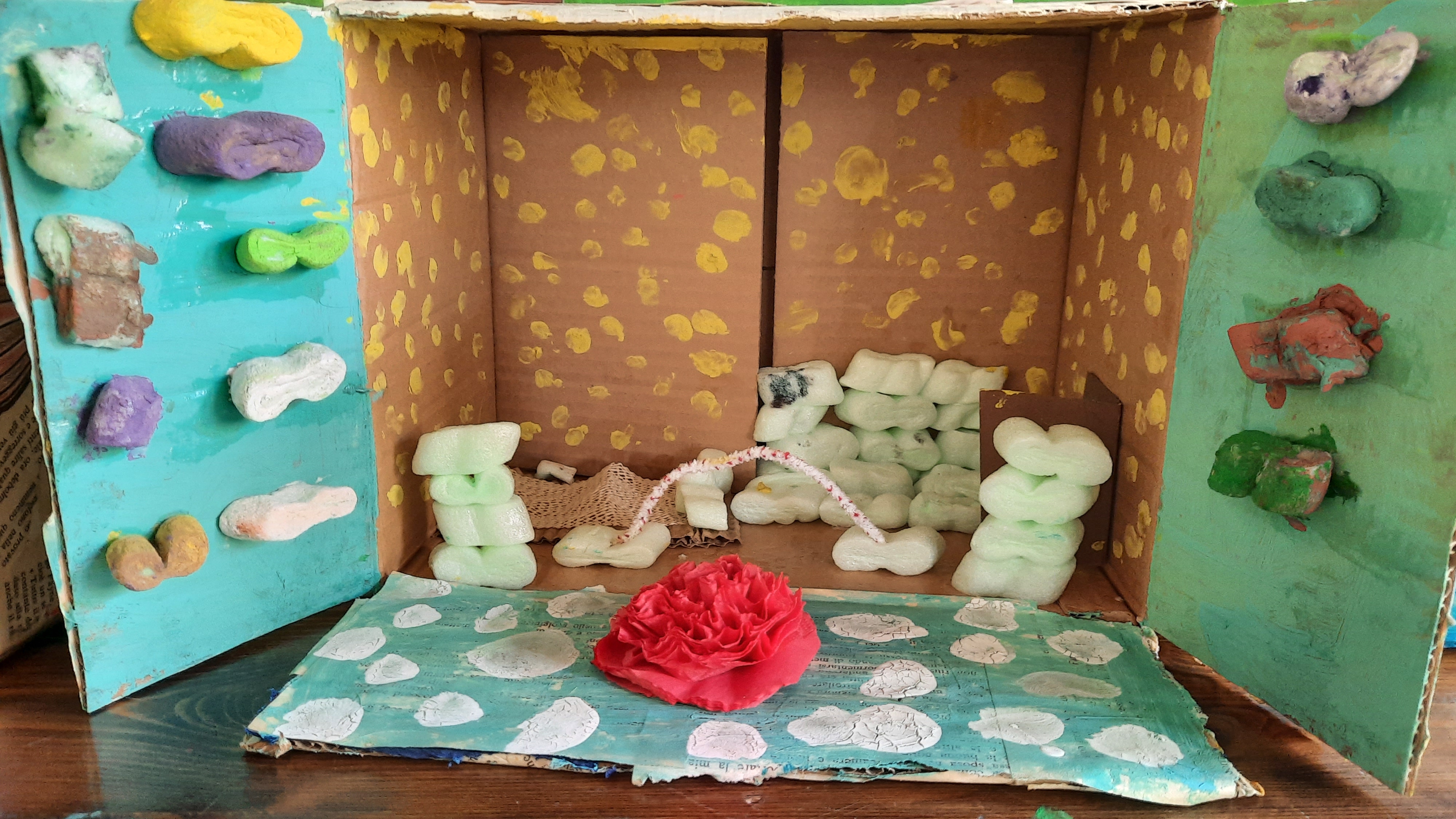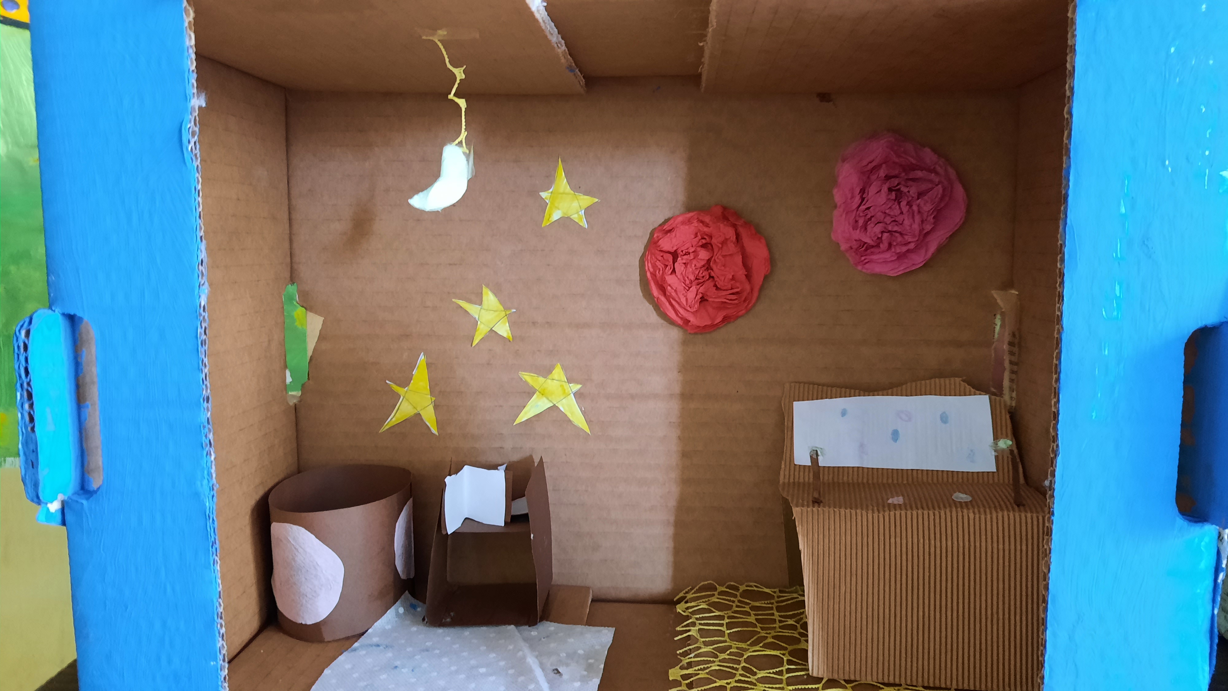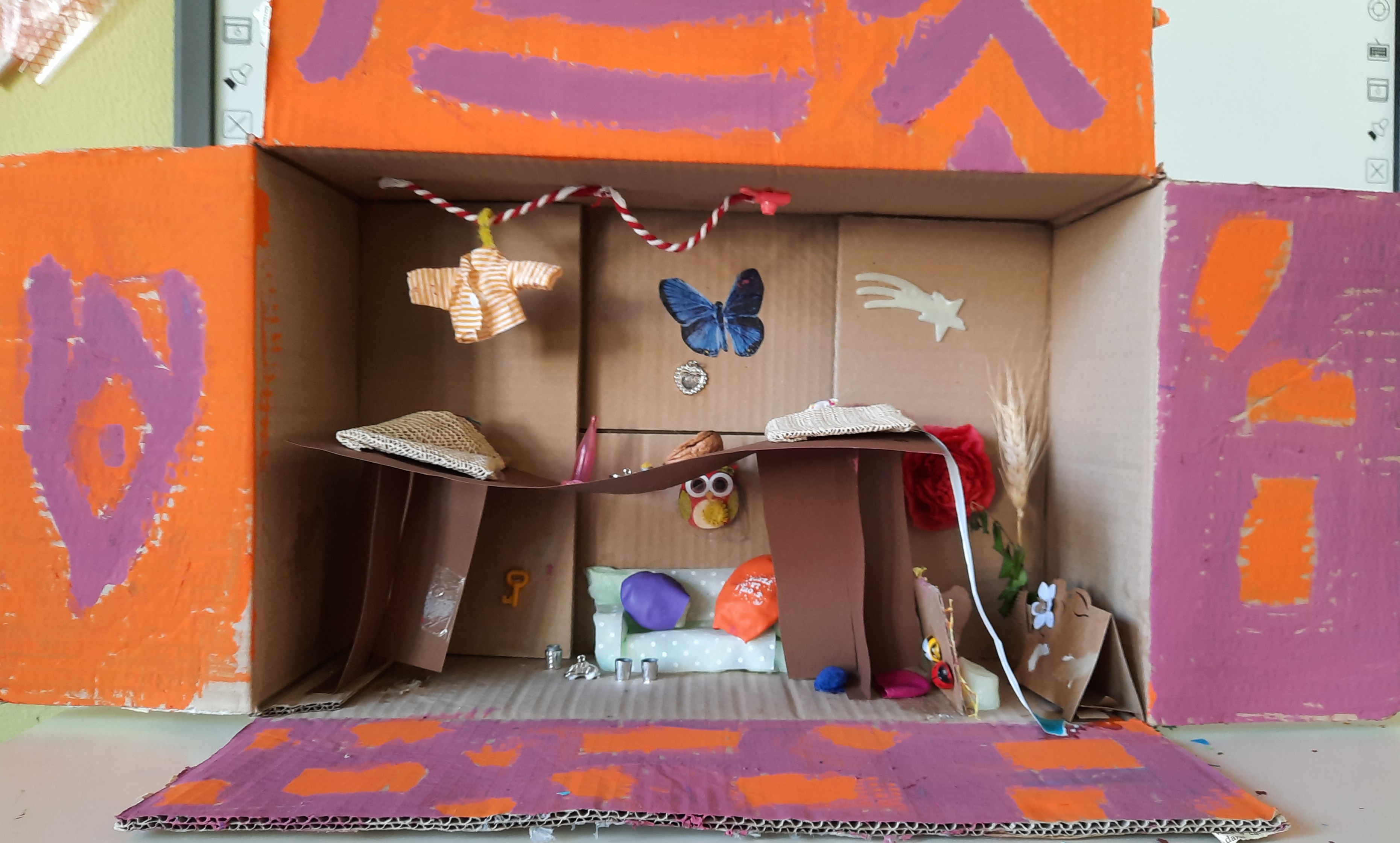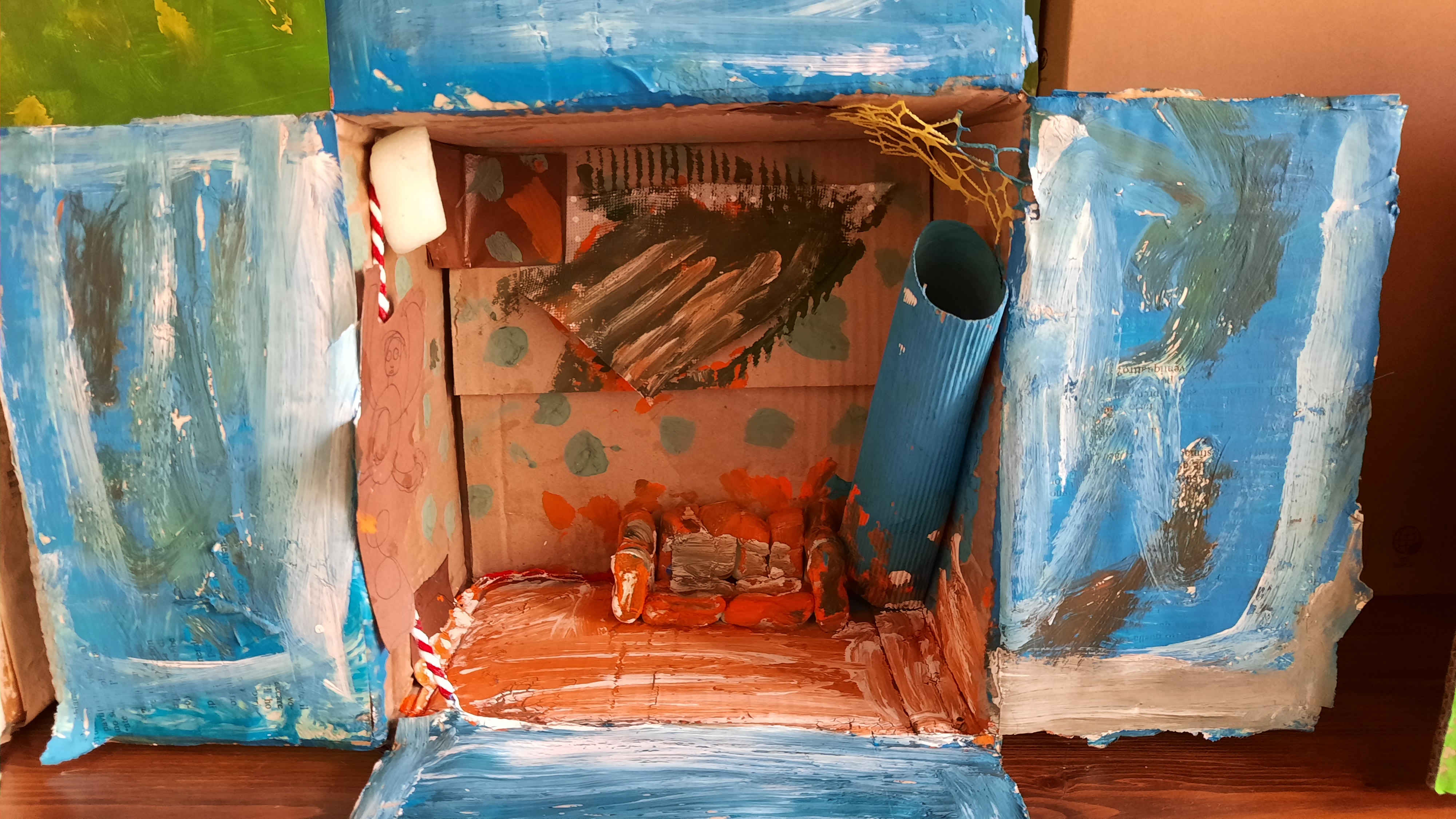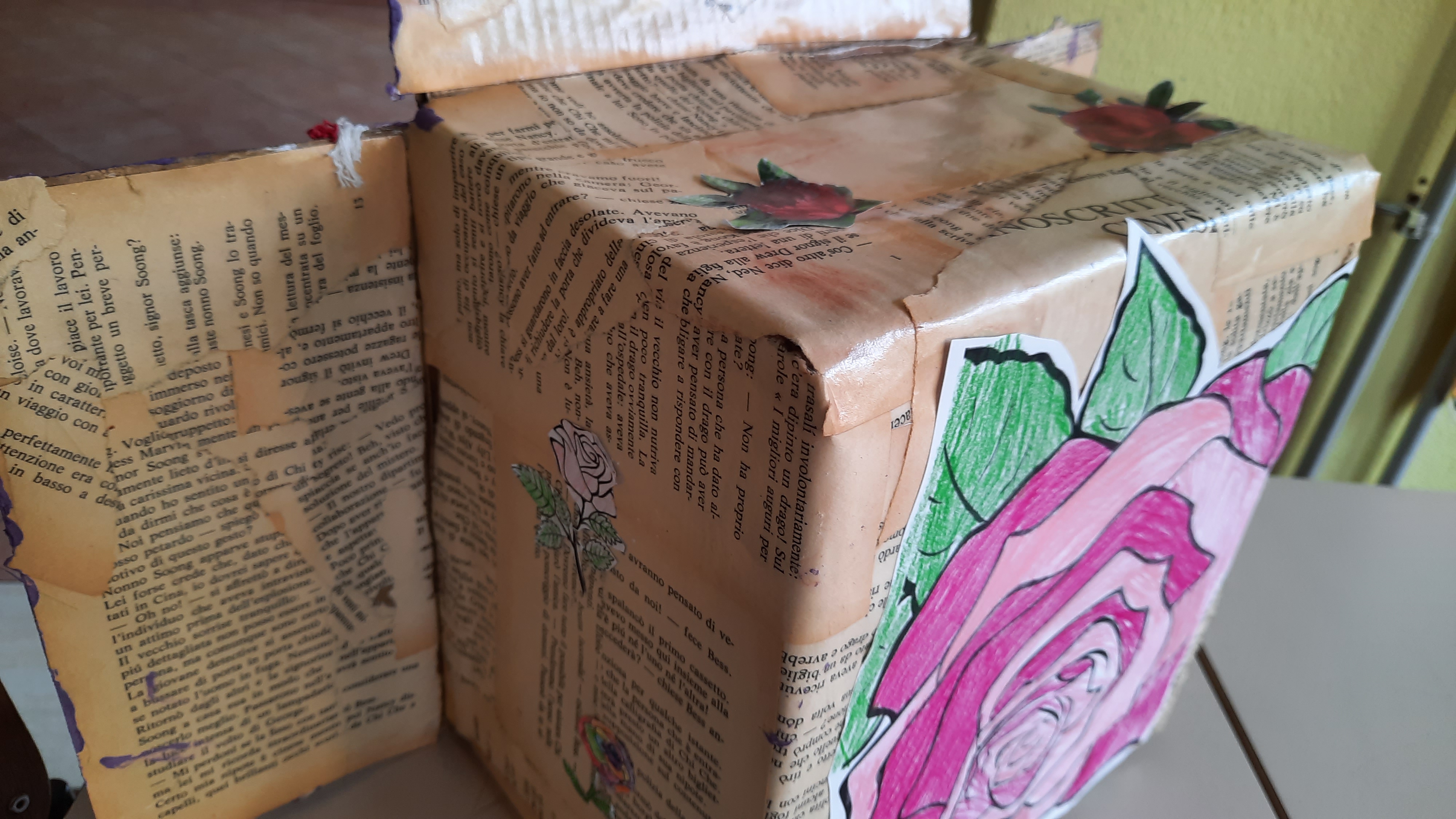 Attività espressiva: storie in scatola. La scatola di cartone è un oggetto che richiama il concetto di resilienza trasformativa, poichè ha in sè le caratteristiche per essere trasformata in qualcosa di “altro”, facendo anche una crescita qualitativa, pur restando sempre una scatola. Ecco come una semplice scatola di cartone destinata al macero, data in mano ai bambini, mette in moto il pensiero creativo, che sviluppa le strategie più adatte allo scopo di dare uno spazio fisico, un’ambientazione, una rappresentazione al loro mondo interiore. A piccoli gruppi gli alunni progettano la loro scatola. La ricoprono di carte con la tecnica del decoupage, poi realizzano il suo interno usando tempere, colori acrilici e materiale di recupero . Infine c’è la fase importante della narrazione. Ogni gruppo condivide con gli altri la “storia” contenuta nella sua scatola. Avendo più tempo a disposizione le narrazioni possono essere registrate e diventare un libro.