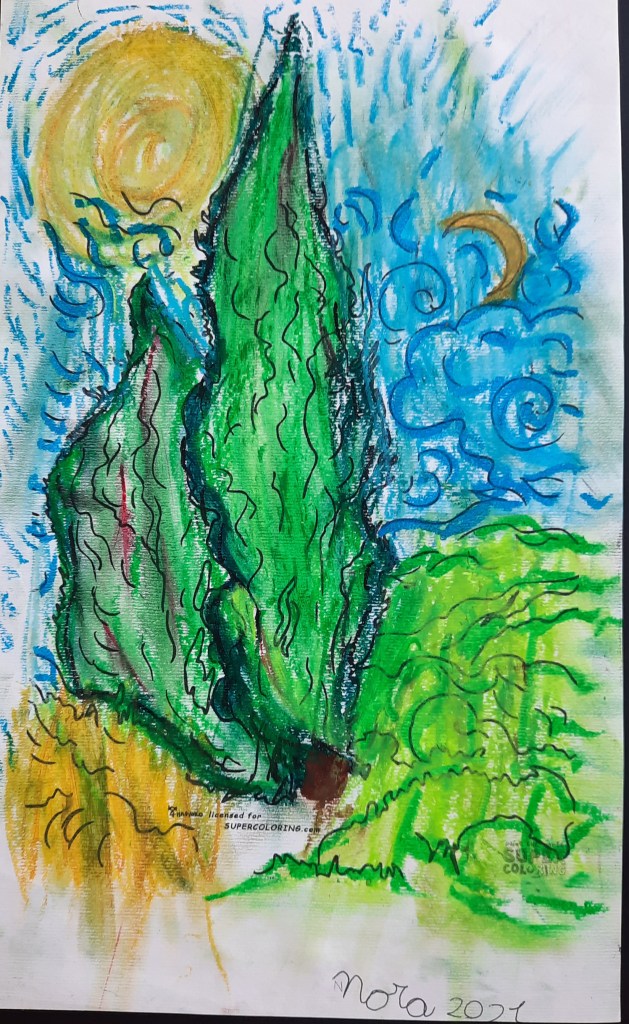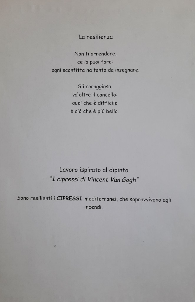 7° Giorno – In natura chi sono i più resilienti? Facciamo una ricerca su internet. Scopriamo che nel mondo vegetale è un albero che conosciamo bene: il cipresso mediterraneo, che ha la capacità di resistere agli incendi. Realizziamo un disegno con i pastelli a olio ispirato al dipinto “I cipressi” di Van Gogh