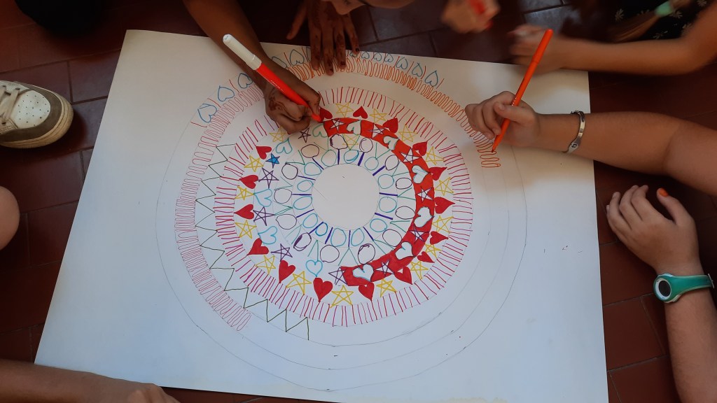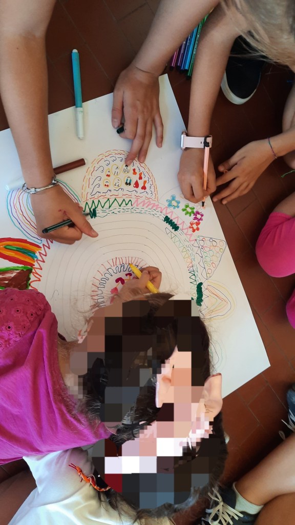 Siamo giunti all’ultima fase di questo percorso. Viene realizzata una grande opera collettiva. In questo lavoro si ritrovano i tre concetti cardine che hanno ispirato il laboratorio: