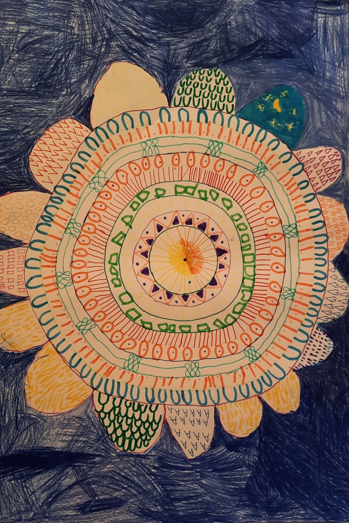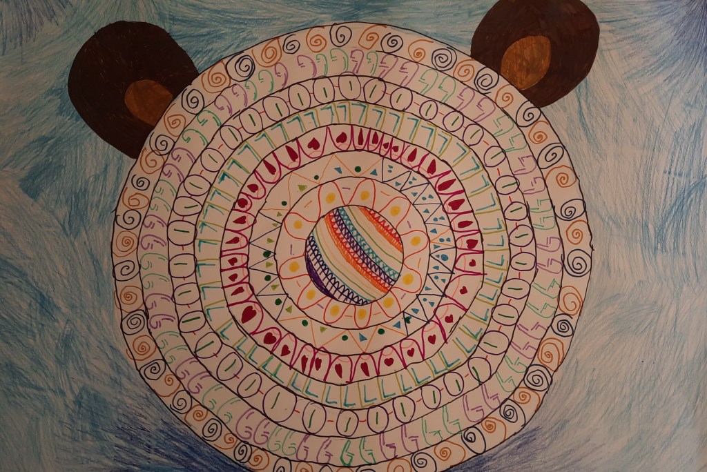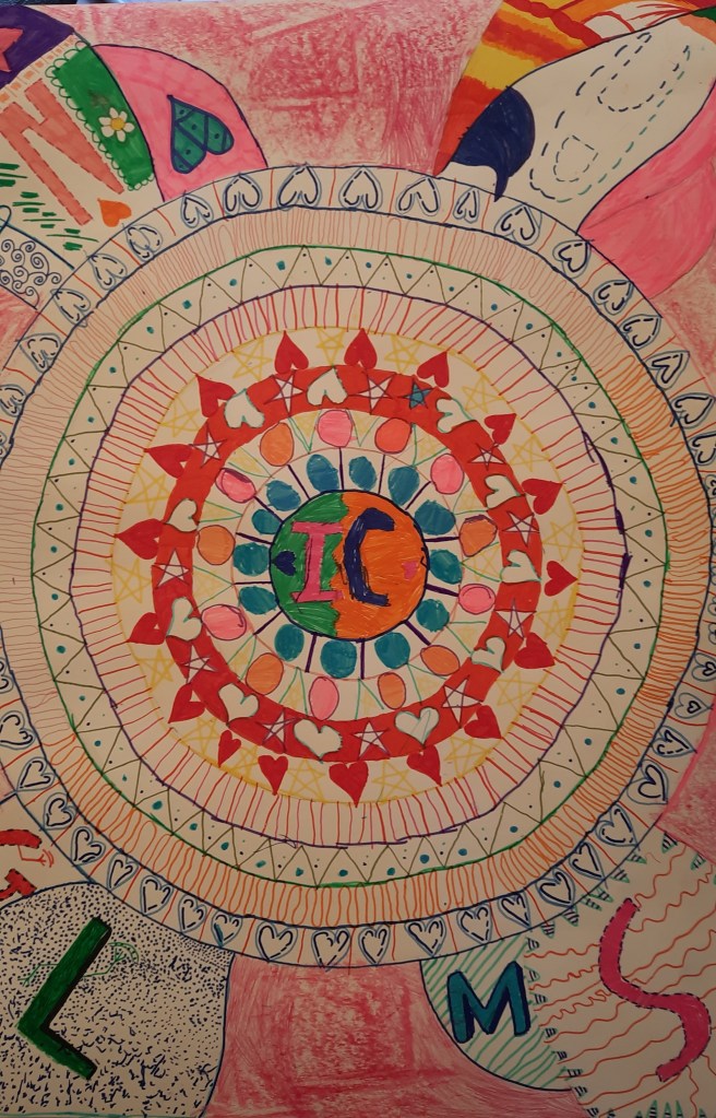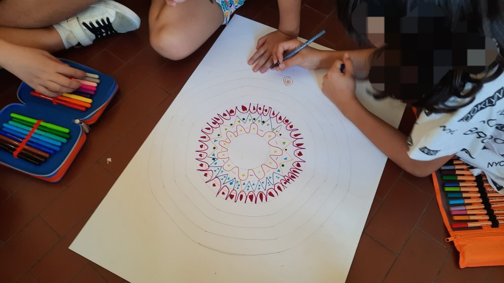 Il primo giorno di scuola gli studenti “grandi” si preparano ad accogliere gli ultimi arrivati. Quest’anno, pensando alla parola “accogliere” e al suo significato etimologico di “legare insieme”, ho programmato questa semplice ma efficace attività da fare a più mani. Ho realizzato su un cartoncino grande una serie di cerchi/ovali concentrici.